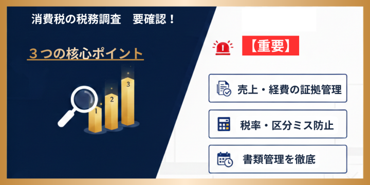 消費税の税務調査は、「売上と仕入れの記録が正確で、かつ法律に基づいた処理がされているか」に焦点が絞られます。特に、以下の3項目は調査官が最初に厳しくチェックする核心ポイントです。